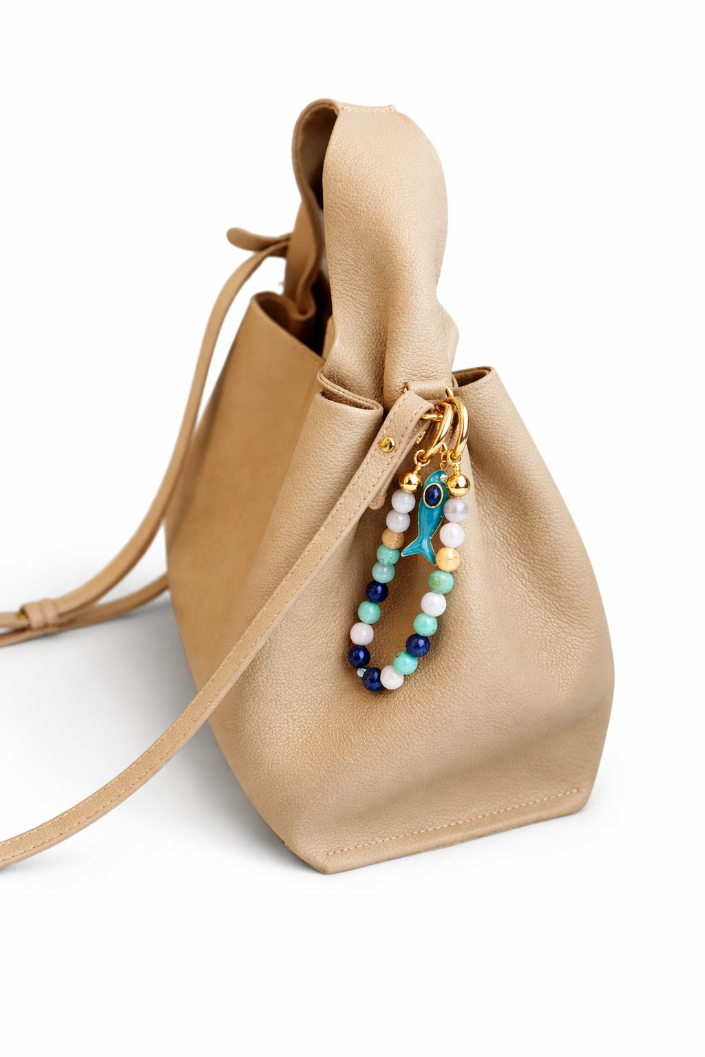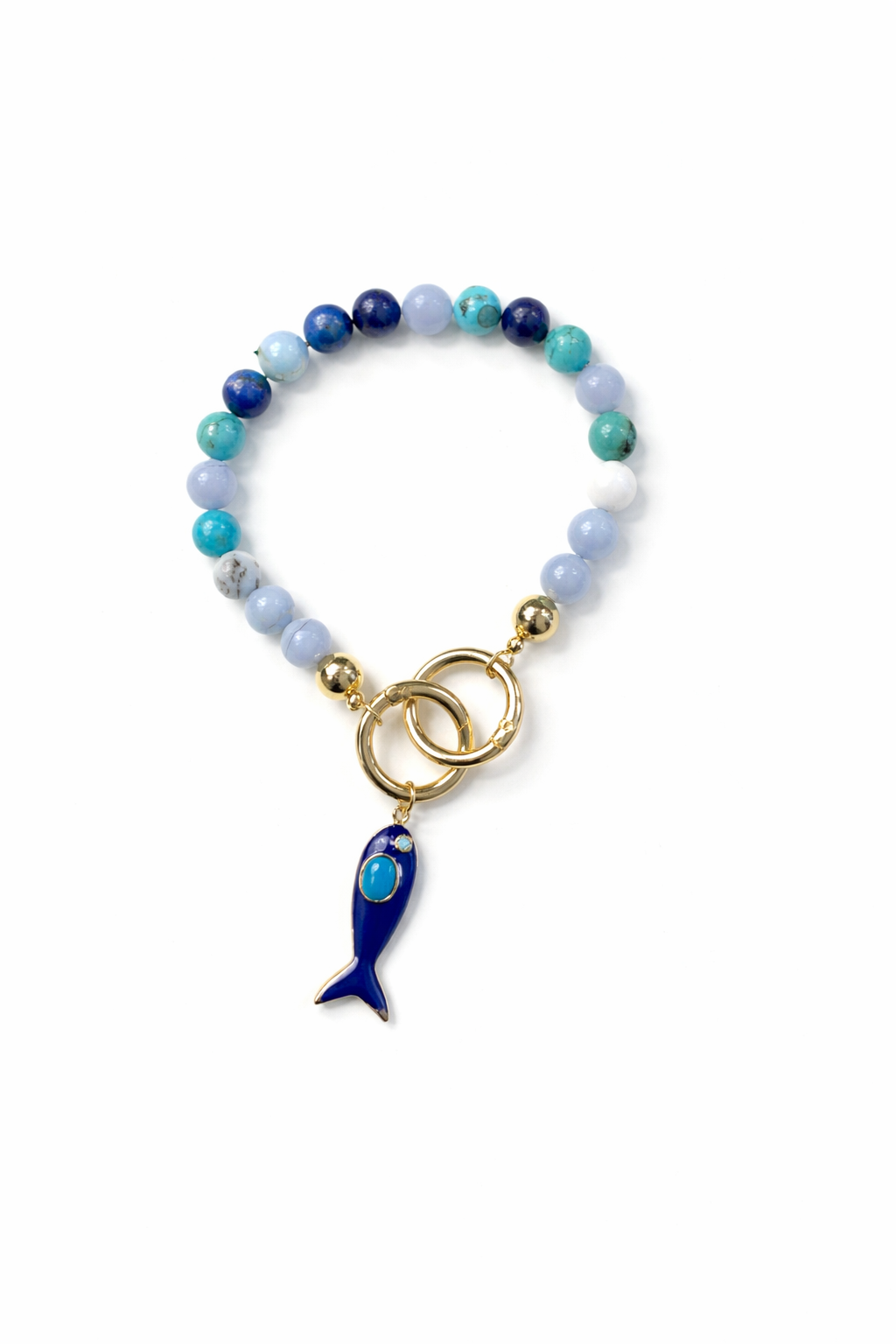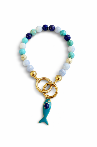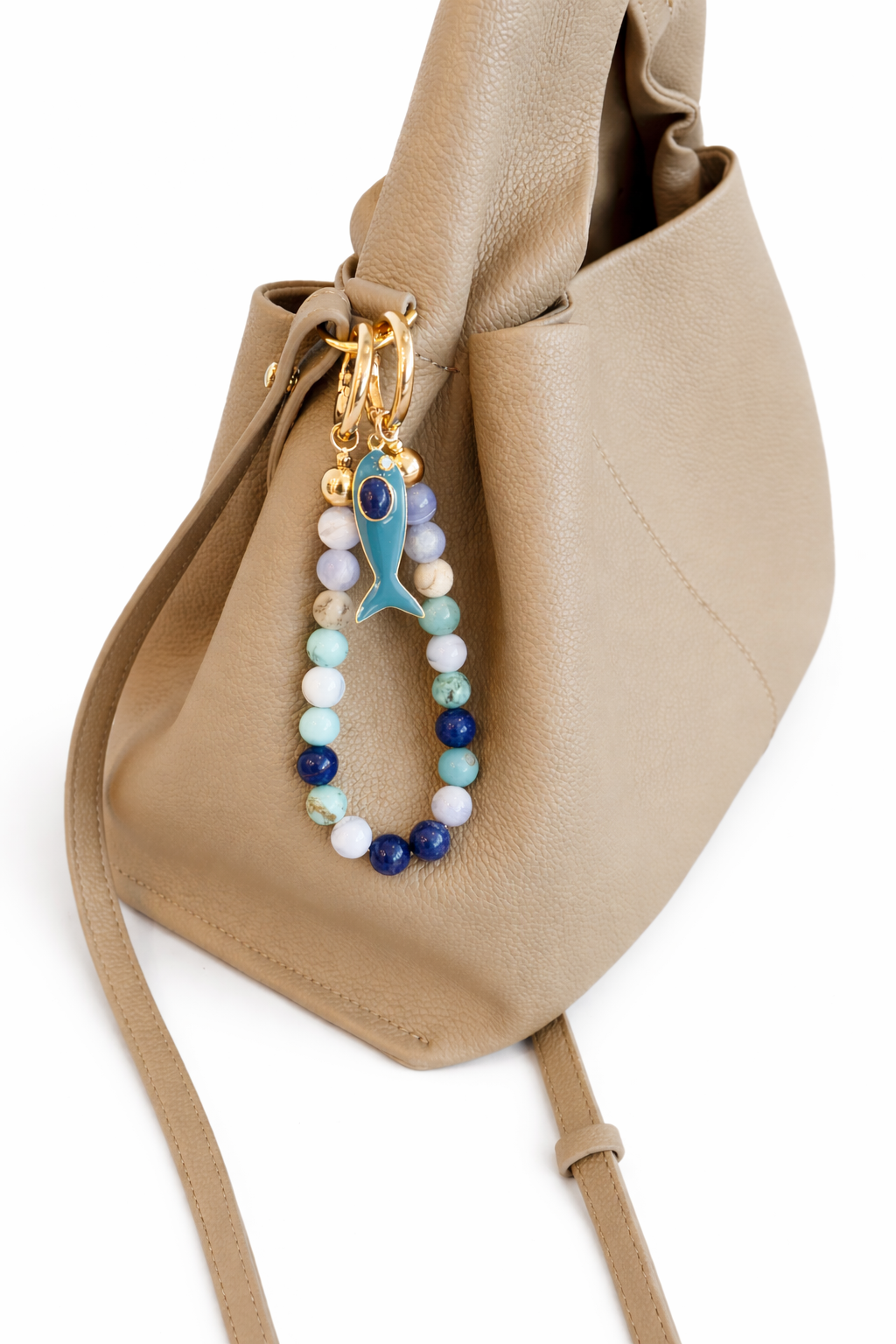 Crafted with 10mm AAA+ quality polished stones (larger than the 6mm stones used in our bracelets), this piece features a fish lacquer charm, a symbol often associated with protection, abundance, and good fortune. Designed to clip easily onto handbags or totes, it can also be used as a keychain.